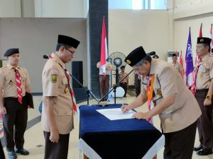 Ketua Kwarda Riau Kak Kasiarudin, SH menandatangani berita acara pelantikan Mabicab Gerakan Pramuka Siak